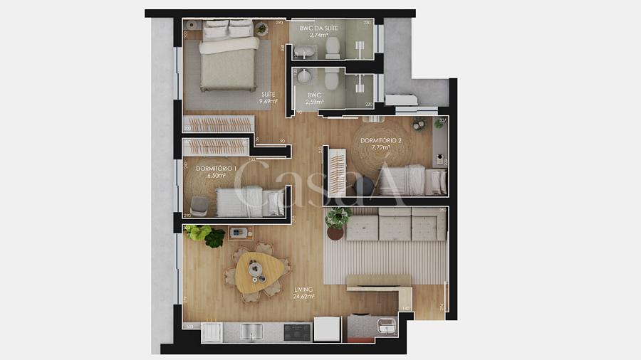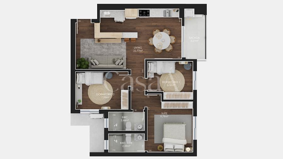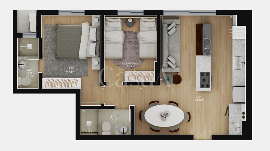 Plantas com 1 suíte + 1 dormitório e 1 suíte + 2 dormitórios